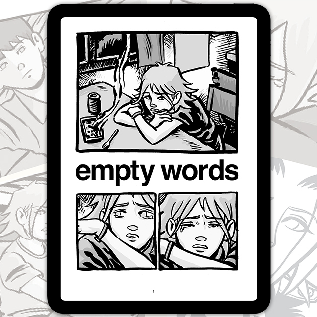 Empty Words is a graphic novel about a difficult relationship between two people brought together by a nursing home, set in Toronto's Queen Street West neighbourhood. It was the author's debut long-form comic, originally collected for print in 2009.